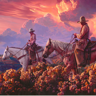 Another example of the cinematic inspiration, this piece has a very dramatic angle, juxtaposing the two cowboys in the front against brightly-lit billowing clouds in the background. The stormclouds and deep, warm tones create an almost ominous, foreboding feel to it.